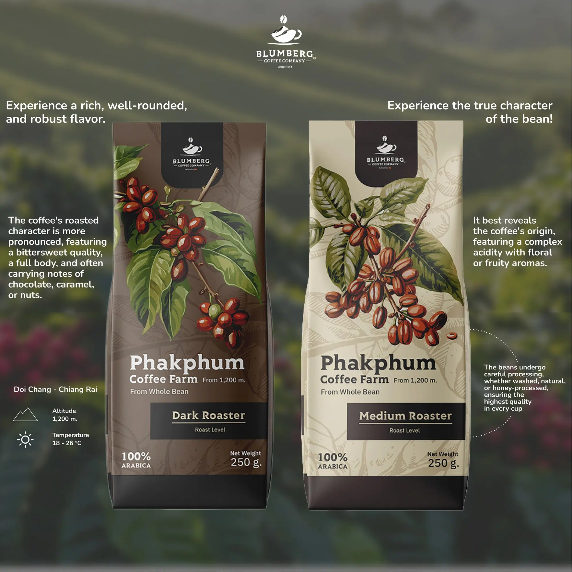 Blumberg Coffee Company partners with outstanding farms like Phakphum to bring you coffee that matters. Grown over 1,200 meters above sea level and hand-harvested from the highlands of Doi Chang, every bean is nurtured by local farmers without chemicals and roasted to perfection. When you choose coffee from sources like Phakphum Coffee Farm, you’re not just enjoying exceptional flavor—you’re supporting sustainable agriculture, empowering farming communities, and experiencing the authentic taste of Thai highlands coffee.
